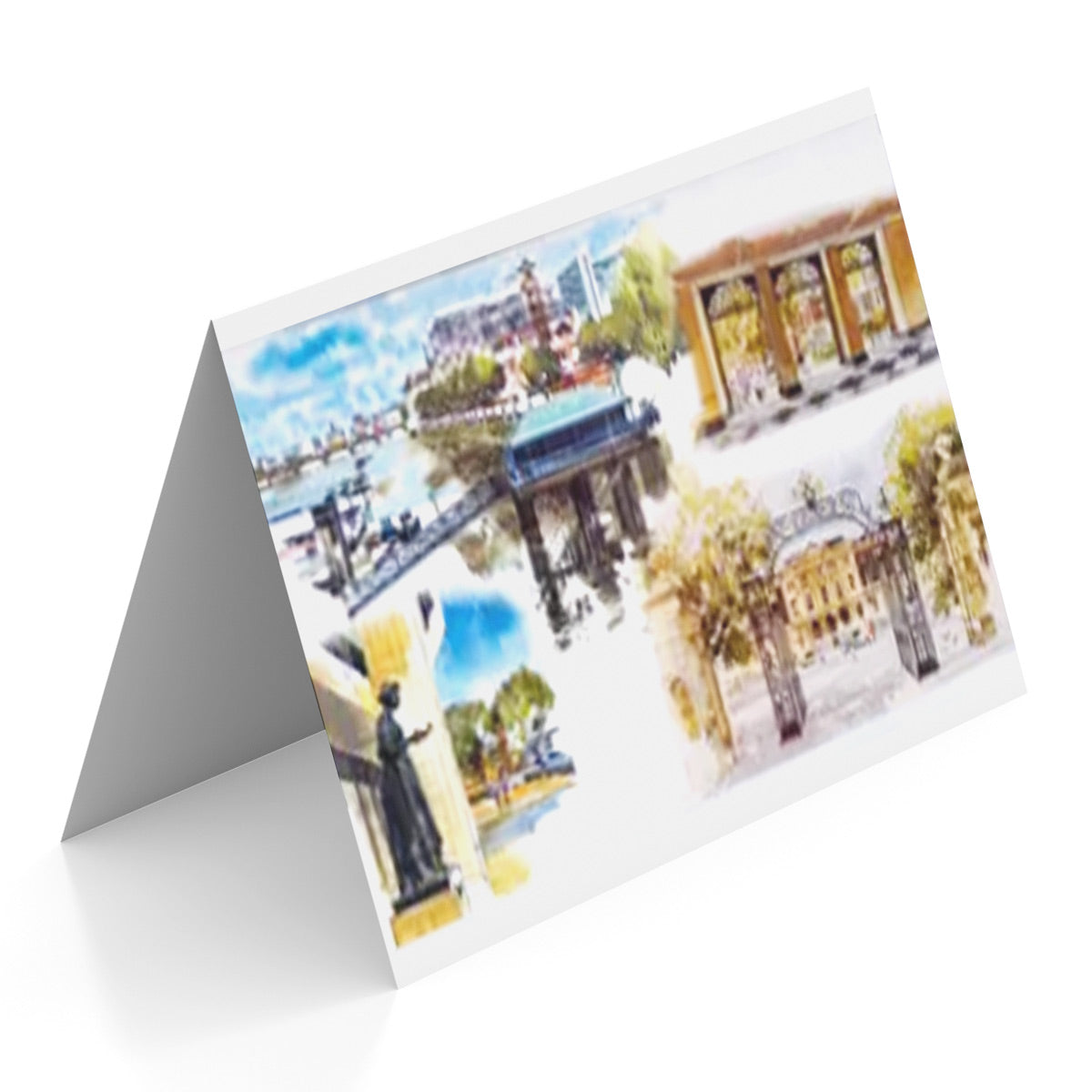 Landscape card, 8.5 x 6 showing 2 aspects of the St Thomas' Hospital and 2 of Guy's Hospital (Blank Inside), includes envelope."